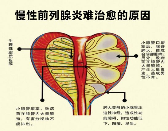 4、慢性前列腺炎引起的慢性附睾炎、附睾纤维化,结节形成,输精管炎、射精管口阻塞等输出管道的变化,造成部分性的排精困难,或完全性的梗阻性无精子症,从而引起男性不育。